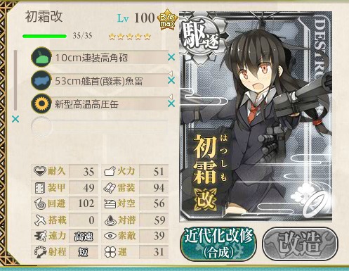 はい、我が鎮守府の駆逐エース、初霜。レベリング用装備になってますが。